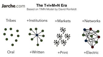 Netzwerkgesellschaft nennt Manuel Castells bereits 1996 die am Horizont aufscheinende neue Gesellschaftsformation. «Von den nationalen Kommunikationsräumen des Buchdrucks zu den globalen Netzen der digitalen Medien» heißt der wegweisende Untertitel des oben zitierten Essays von Michael Giesecke. Die Grafik von David Ronfeldt und Harold Jarche ist nur ein Beispiel von vielen. Medium als Kriterium zur Periodisierung von Gesellschaftsepochen ist erst mit der Durchsetzung des digitalen Mediums als Leitmedium entstanden. Davor waren andere Dinge als epochemachend verstanden worden: Erst die Götter, dann die Ideen und Taten großer Männer, der Weltgeist, die Produktionsweise.