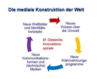 Gleichgültig, wo wir mit der Betrachtung der Grafik anfangen, es ist nie der «wirkliche» Anfang. Wir können also mit der Erklärung überall beginnen, z. B. links unten: Neue Medien führen zu neuen Weltbildern, diese führen zu neuem Wissen über die Welt (und uns selbst), das erzeugt neue Wahrnehmungsprogramme und diese führen schließlich wieder zur Entwicklung neuer Kommunikations- und Medienformen. Der Zusammenhang ist also nicht monokausal linear, sondern komplex: Das bedeutet, dass alles sowohl Ergebnis als auch Voraussetzung eines ko-evolutionären Prozesses ist, in dem die einzelnen Einheiten sich in wechselseitiger Abhängigkeit entwickeln. Medien sind nicht beliebig (z. B. für didaktische Zwecke) austauschbare «Hilfsmittel», «an den Inhalten klebt Medienmaterial», sagt Giesecke. Und ebenso gilt umgekehrt: An den Medienformen kleben Inhalte, Ideen und ganze Weltbilder.